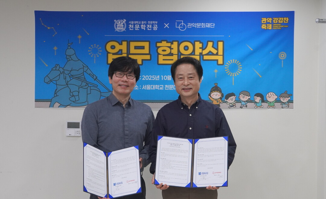 (왼쪽) 천문학전공 윤성철 전공주임교수, (오른쪽) 관악문화재단 소홍삼 대표이사   지난 2025년 10월 1일, 서울대학교 물리천문학부 천문학전공(전공주임 윤성철)은 관악문화재단(대표이사 소홍삼)과 업무 협약을 체결하였다.  서울대학교 천문대에서 진행한 협약식에는 천문학전공 윤성철 전공주임 교수, 황소성 교수와 관악문화재단 대표이사 및 주요 관계자들이 참석하였다.  양측은 ▲천문학 교육·체험 행사 공동 운영 ▲관악강감찬축제 연계 프로그램 개발 ▲전문 인력·장비·정보 상호 교류 ▲시설 및 행사 운영 협력 등을 체계적으로 추진할 계획이다. 윤성철 교수는 “천문학의 연구성과를 지역사회와 나누는 일은 학문과 문화가 함께 성장하는 좋은 사례가 될 것”이라며, “이번 협약이 지속적인 협력의 기반이 되기를 기대한다”고 말했다. 소홍삼 관악문화재단 대표이사는 “서울대와의 협력을 통해 천문학을 매개로 한 새로운 문화예술 콘텐츠를 지역에 확산하고, 차별화된 축제 모델을 개발해 나가겠다”고 밝혔다. 출처 : 로컬세계(https://localsegye.co.kr)   ► 관련기사  관악문화재단–서울대 물리·천문학부, 천문학 대중화 위해 손잡다 [로컬세계(https://localsegye.co.kr), 2025/10/10