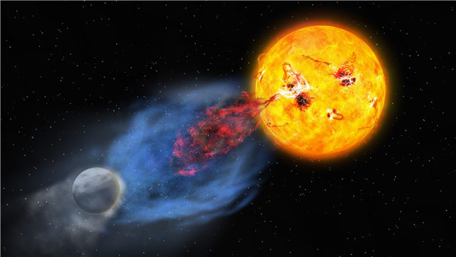 ‘젊은 태양’ 에서 다중 온도 코로나질량방출의 징후 발견! - ‘젊은 태양’에서 과거 태양폭풍의 단서를 찾다. -   □ 연구필요성 과학자들은 태양이 내뿜는 플라스마 폭풍, 즉 코로나질량방출이 과거에는 지금보다 지구에 훨씬 큰 영향을 미쳤을 것으로 여기고 있다. 그래서 이런 과거의 태양 활동을 이해하기 위해, 수소 알파선 분광 관측을 통해 젊은 태양별과 비슷한 항성에서 나오는 코로나질량방출을 관측하고자 해 왔으나, 충분히 빠른 속도를 가진 분출 현상이 예상보다 적었다. 이 문제를 해결하기 위해, 서울대학교 연구진이 포함된 국제 연구팀은 허블우주망원경과 지상망원경의 공조 관측을 수행했다. □ 연구성과/기대효과 국제 연구팀은 공조 관측을 통해, 용자리 EK별에서 1만 K 온도를 보이는 플라스마의 분출과 온도가 10만 K인 플라스마의 분출이 동시에 일어나고, 10만 K 온도 플라스마는 1만 K 온도 플라스마보다 매우 빠른 속도로 분출함을 세계 최초로 확인했다. 이는 예상했던 바와 같이 코로나질량방출이 초기 태양에서 자주 발생했음을 지지해 주는 연구 성과이다. 태양 활동이 과거에 지구의 생명 출현 및 진화에 미친 영향을 밝히는 데에 기여할 것이다. □ Journal Link : Nature Astronomy, https://doi.org/10.1038/s41550-025-02691-8  □ 연구내용 o 과거에 태양폭풍은 매우 강하고 빈번해서, 지구상의 생명체 서식 환경에 막대한 영향을 줄 정도였음을 뒷받침해 주는 최신 과학 연구 결과가 논문으로 발표되었다. o  태양폭풍은 태양에서 폭발적으로 밝아지는 플레어, 그리고 플레어와 연관되어 행성간 공간으로 방출되는 거대한 플라스마 덩어리인 코로나질량방출을 아울러 이르는 현상이다. 태양폭풍은 지구의 고층대기와 자기권에 영향을 미쳐, 우주기상 현상을 지배하고 있다. o 그런데 과거에 태양폭풍은 지금보다 훨씬 강했을 것이며, 훨씬 자주 일어나서, 지구 대기를 벗겨 내고, 강력한 우주방사선을 생산함으로써, 지구상 생물체의 서식 환경에 매우 위협적인 요소로 작용했을 것으로 보인다. 하지만 과거 태양 활동을 관측이나 실험으로 알아내기란 거의 불가능하다. o  과학자들이 대안으로 찾아낸 것은 과거 태양과 비슷한 외계 항성을 관측하는 것이다. 용자리 EK별은 태양의 나이가 1억 년보다 어렸을 때의 모습과 매우 비슷한 항성이다. 과학자들은 이 별을 지상에서 관측하여 코로나질량방출의 단서를 찾아내는 데 성공했다. 하지만 예상과 달리, 이 별에서 분출 속도가 충분히 빠른 경우는 드물어서, 강력한 코로나질량방출이 정말 자주 일어나는지 의구심이 생기게 되었다. 이 문제를 풀기 위해, 서울대학교 물리천문학부 채종철 교수와 연구원들이 참여한 국제 연구팀은 허블우주망원경과 한국과 일본의 지상망원경을 동시에 가동하여 용자리 EK별의 공조 관측을 수행했다. 서울대학교 연구팀은 한국천문연구원이 운영하는 보현산천문대의 고분산에셸분광기(BOES)를 사용하여 가시광 분광 관측을 수행했다. o  이 공조 관측으로부터 국제 연구팀은 용자리 EK별에서 코로나질량방출이 다중 온도 플라스마로 구성되었다는 관측적 증거를 세계 최초로 확보하였다. 연구팀은 허블우주망원경의 자외선 분광기로부터 온도가 10 만 K인 따뜻한 플라스마가 초속 300에서 500 킬로미터로 방출되는 순간을 포착했으며, 이로부터 10분 후 보현산천문대 고분산분광기로부터 온도가 1만 K인 차가운 플라스마가 초속 70 킬로미터로 지속적으로 방출되었음을 확인했다. 따뜻한 플라스마는 차가운 플라스마보다 훨씬 많은 에너지를 실어 나르고 있었다. 이는 차가운 플라스마 관측으로만 추정하는 것보다, 이 별에서 훨씬 강한 항성폭풍이 더 자주 일어나고 있음을 의미하며, 이로부터 태양에서도 과거에는 강력한 태양폭풍이 빈번하게 일어났을 것으로 추정할 수 있다. o 서울대학교 연구팀의 채종철 교수는 “초기의 젊은 태양에서 발생하는 강력하고 빈번한 태양폭풍은 초기 지구의 자기권과 대기를 벗겨 내고, 다량의 우주방사선을 생산해 냄으로써 지구상 생명체 출현과 서식 환경에 영향을 미쳤을 것”이라고 말한다. 본 연구 성과는 한국, 일본, 미국의 국제적 협력 및 우주관측과 지상관측의 정밀한 조율에서 얻어졌다. 공조 관측을 이끌었던 일본 교토대학교의 나메카타 박사는 “비록 우리가 나라는 다르지만, 과학을 통해 진리를 추구하는 동일한 목표를 가지고 있다는 것을 알게 되어 기쁩니다.”라고 전했다.   □ 연구결과  Discovery of multi-temperature coronal mass ejection signatures from a young solar analogue Kosuke Namekata, Kevin France, Jongchul Chae, Vladimir S. Airapetian, Adam Kowalski, Yuta Notsu, Peter R. Young, Satoshi Honda, Soosang Kang, Juhyung Kang, Kyeore Lee, Hiroyuki Maehara, Kyoung-Sun Lee, Cole Tamburri, Tomohito Ohshima, Masaki Takayama & Kazunari Shibata (Nature Astronomy, in press) 국제 연구팀은 우주 및 지상 공조 관측으로부터 용자리 EK별에서 1만 K 온도 플라스마의 분출과 10만 K 온도 플라스마의 분출이 동시에 일어나고, 10만 K 온도의 따뜻한 플라스마가 1만 K 온도의 차가운 플라스마보다 매우 빠른 속도로 분출함을 세계 최초로 확인했다. 이는 예상했던 바대